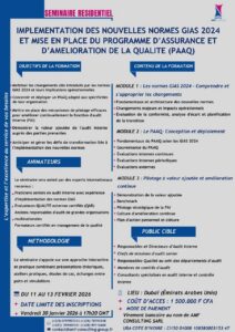 Ce séminaire de trois jours offre une formation approfondie sur les nouvelles normes GIAS (Global Internal Audit Standards) 2024 et leur mise en œuvre pratique, combinée à l’établissement d’un Programme d’Assurance et d’Amélioration de la Qualité (PAAQ) robuste et orienté vers la création de valeur.